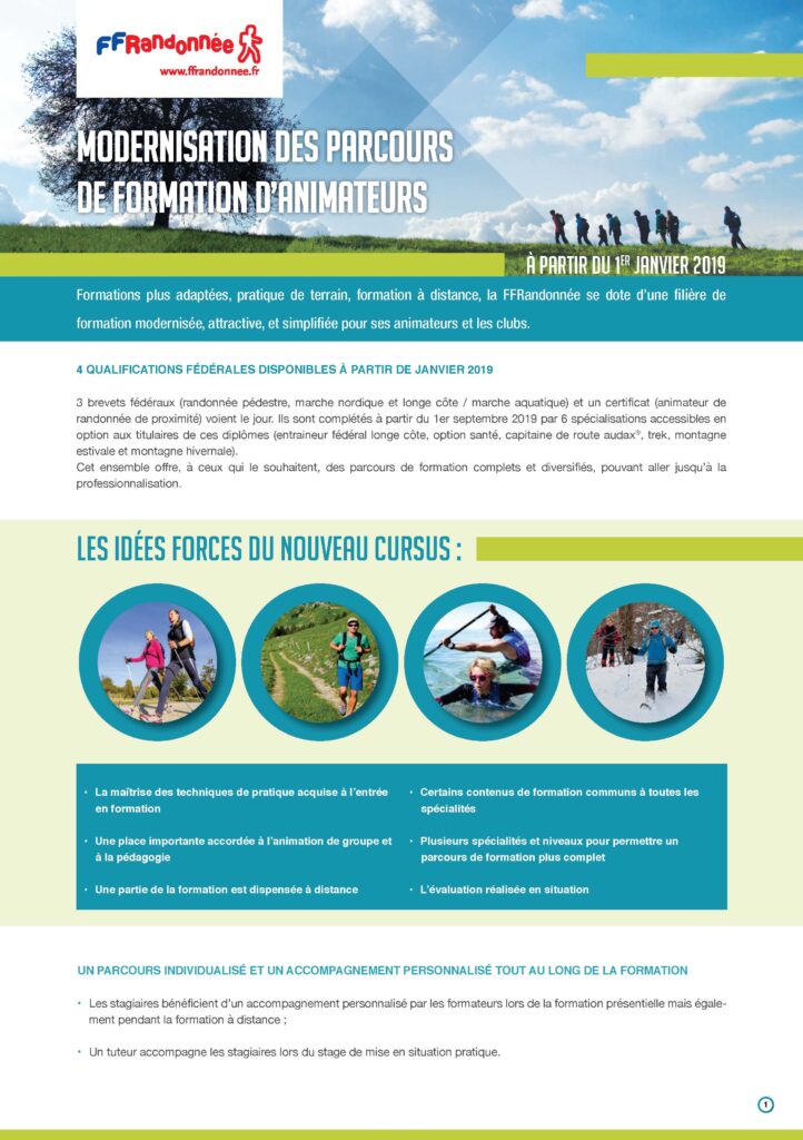 Devenez animateur ! Nous vous proposons des formations pour chaque discipline (randonnée pédestre, marche nordique et longe cote marche aquatique). Avec l’obtention d’une qualification initiale, nous vous offrons aussi la possibilité de vous spécialiser dans une discipline. Les qualifications et diplômes fédéraux d’encadrement attestent, pour leurs titulaires, de la possession de compétences et garantie aux adhérents une séance en toute sécurité. La durée de ces stages peut varier de 2 à 5 jours avec un stage en club sous tutorat pédagogique et des modules de formation à distance. Les formations d’animateurs sont accessibles aux licenciés de la FFRandonnée.