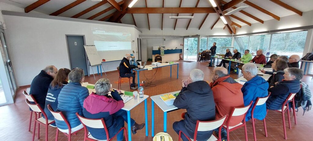 18 animateurs de randonnée certifiés issus de 10 clubs différents se sont retrouvés le 7 mars à Smarves pour un temps de formation continue: l’occasion de s’informer sur les évolutions fédérales , sur les projets du comité Vienne. Un temps a été consacré aussi à la découverte de l’activité bâtons dynamiques où à un entrainement à l’orientation à la boussole. La journée a aussi permis de passer un bon moment de convivialité.