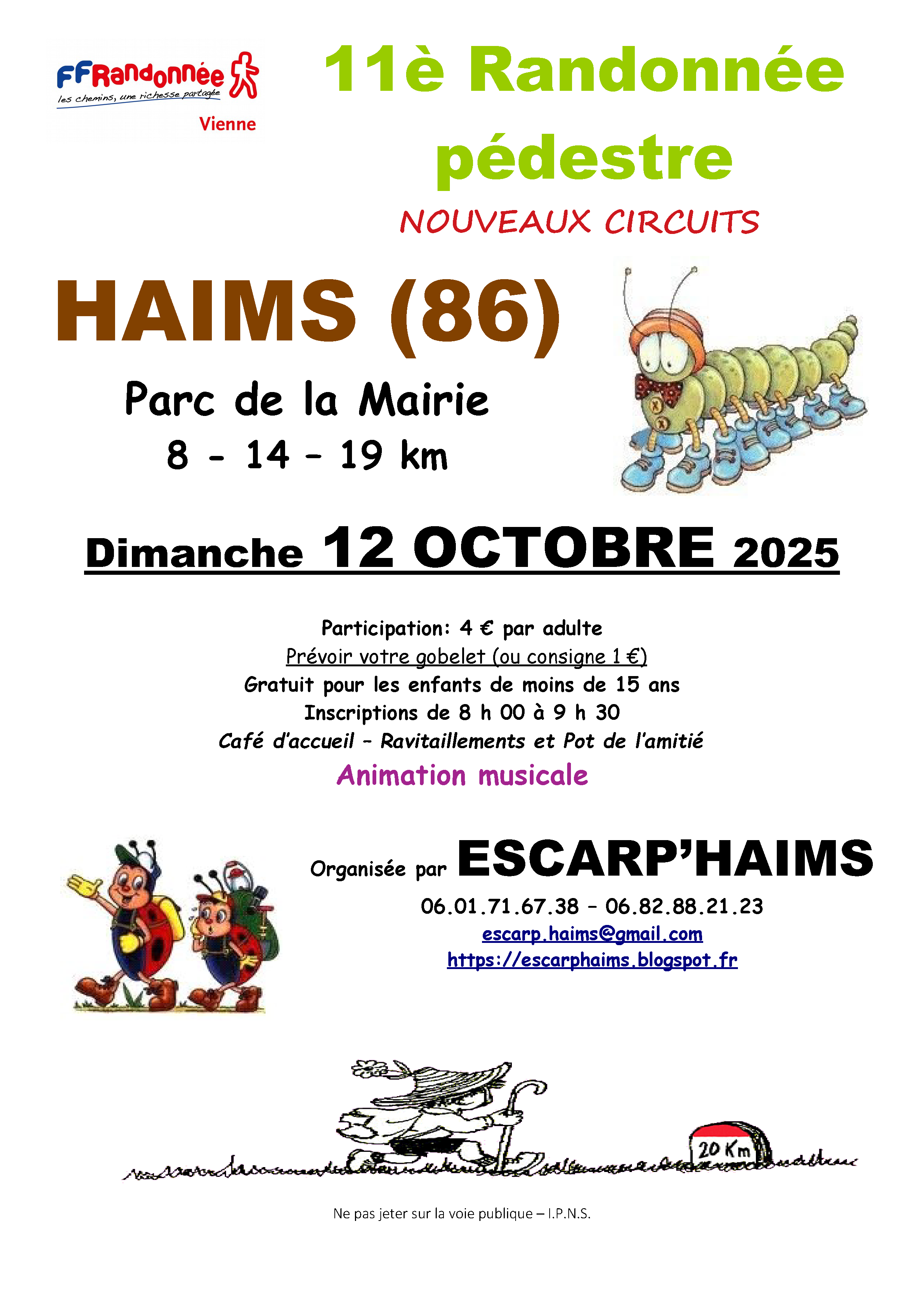 L’association « Escarp’Haims » d’Haims propose le dimanche 12 octobre 2025 une marche ouverte au grand public.